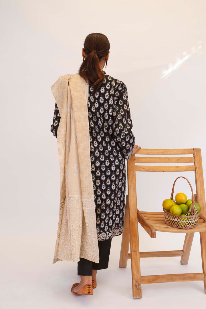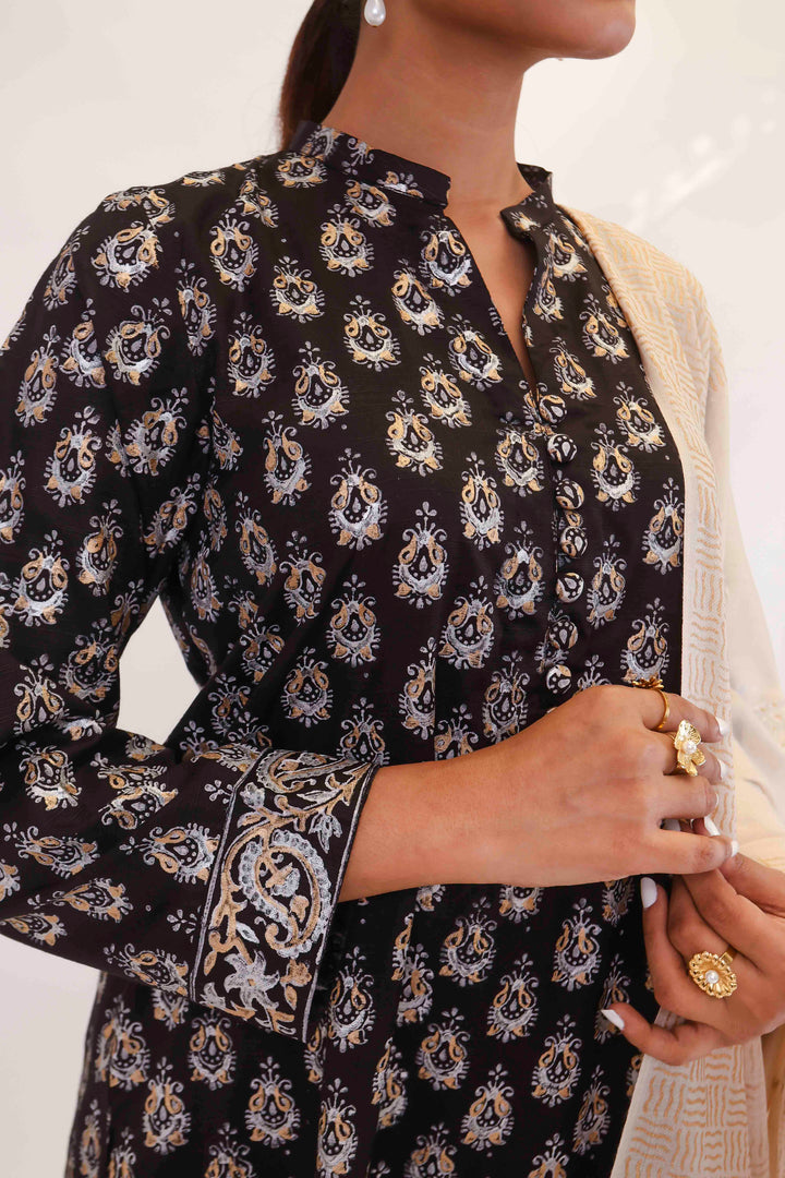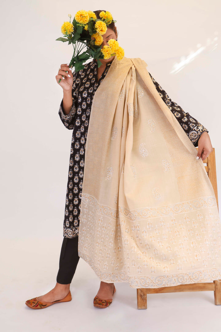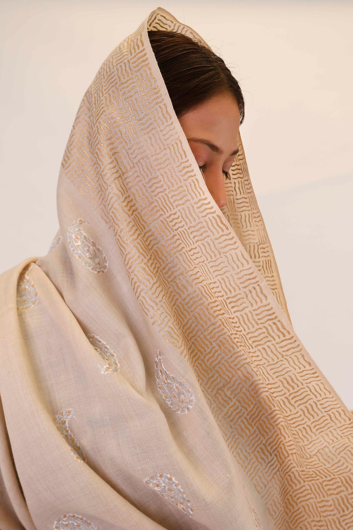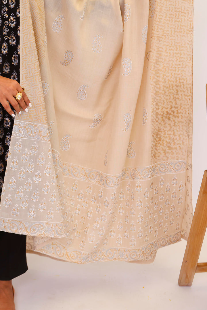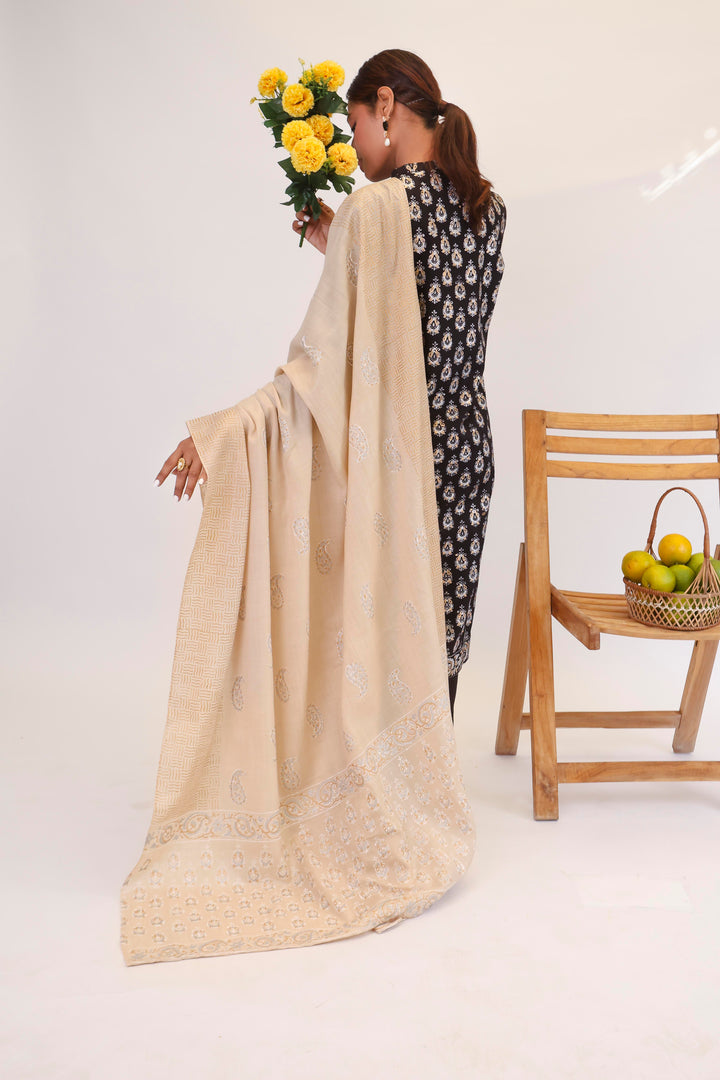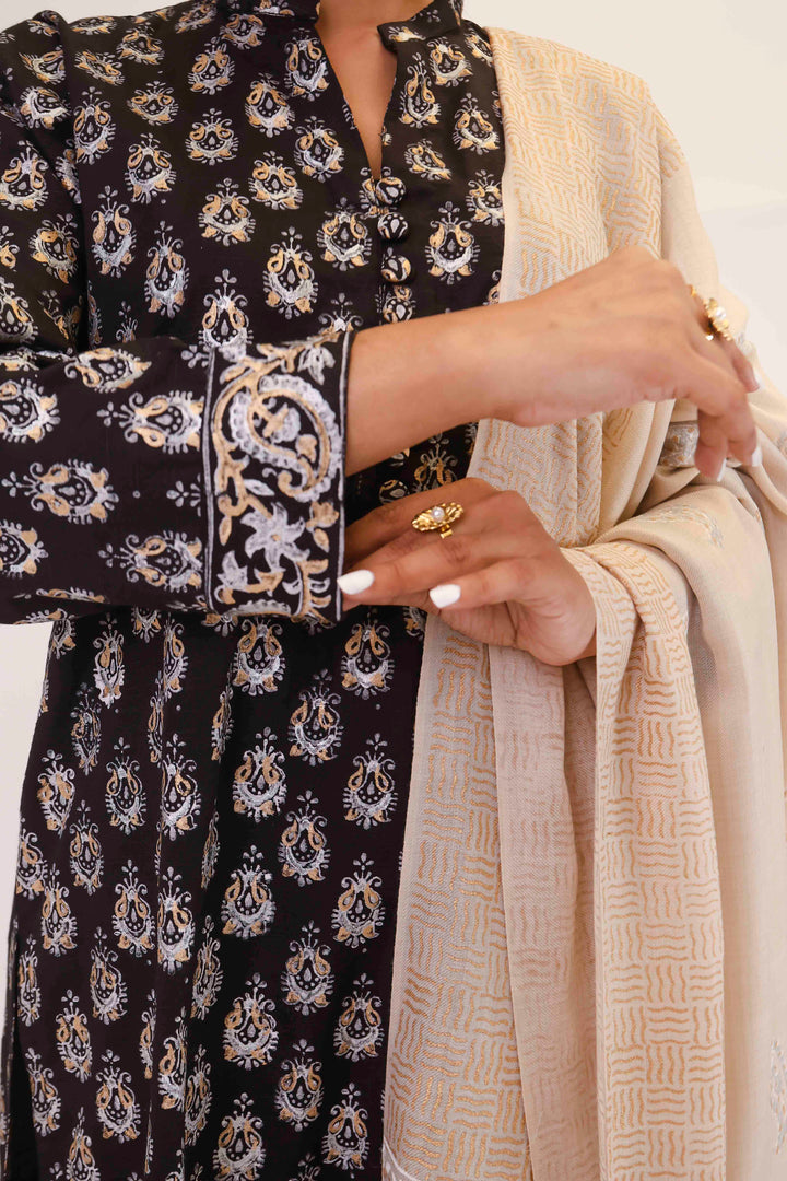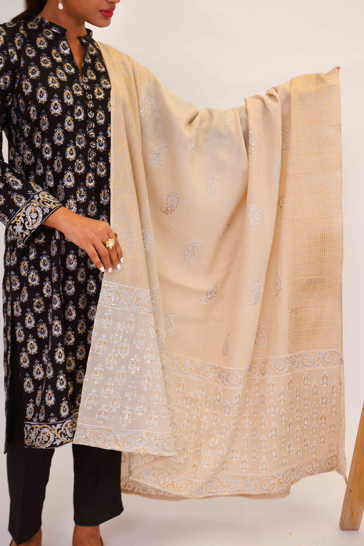 Classic MA gold block printed suit on Winter fabric with Premium Blended Shawl. Shirt has printed motifs all over. Exquisite hand crafted Shawl.