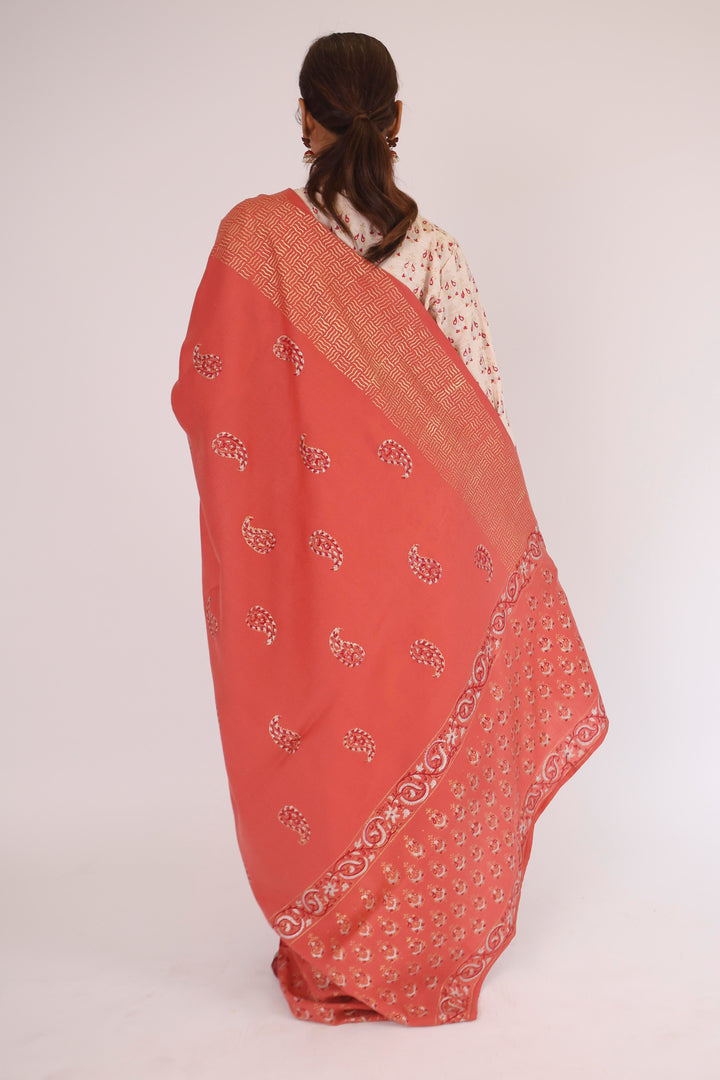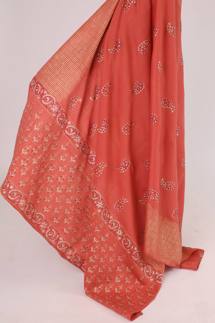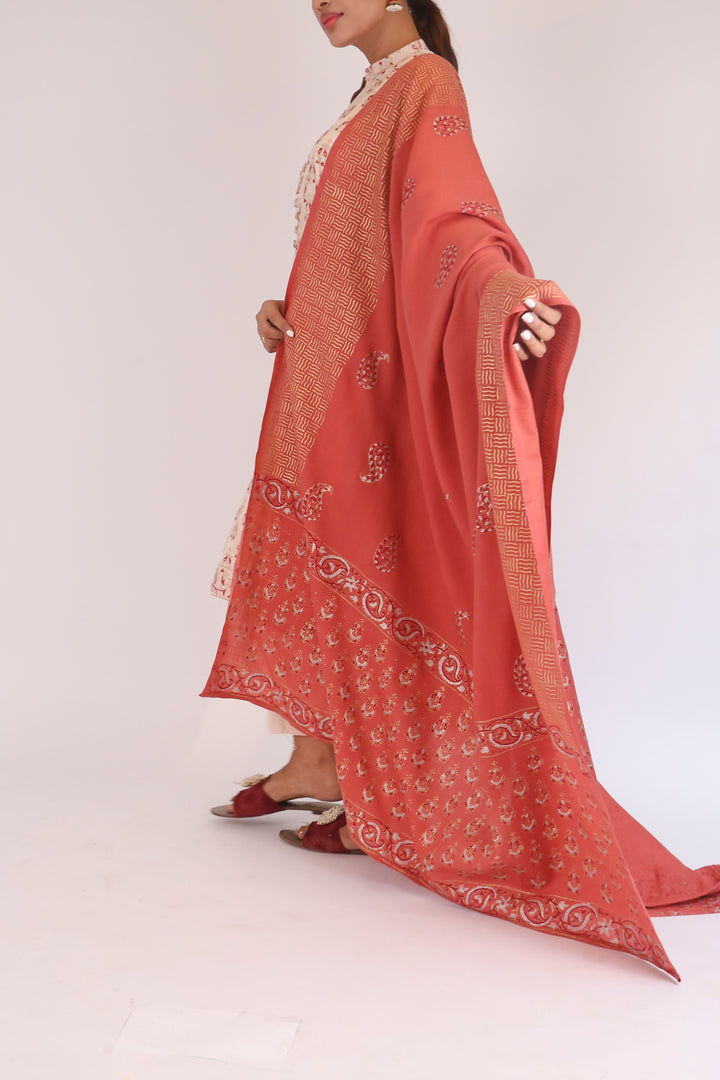 Classic MA gold block printed suit on Winter fabric with Premium Blended Shawl. Shirt has printed motifs all over. Exquisite hand crafted Shawl.