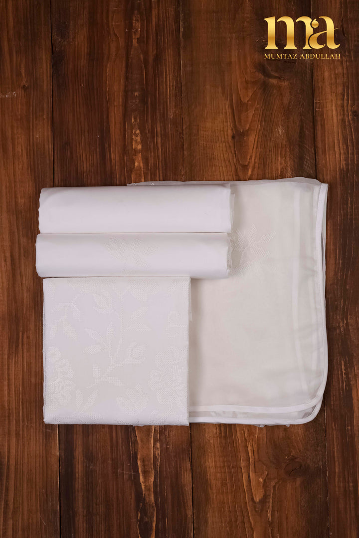 Classic MA embroidered suit on Lawn with chiffon dupatta. Embroidered Cross Stitch jaal on shirt front . Back & Sleeves light motifs. Light embroidered motifs style Chiffone dupatta finished with pipin.