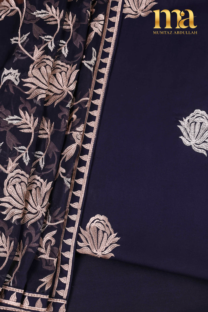Classic MA embroidered suit on Staple Cotton, Soft winter fabric with a silkly finish. Shirt has all over embroidered motifs (silver zarri thead and foan cotton thread combination). Heavy embroidered jaal style Chiffone dupatta finished with embroidered border all round.
