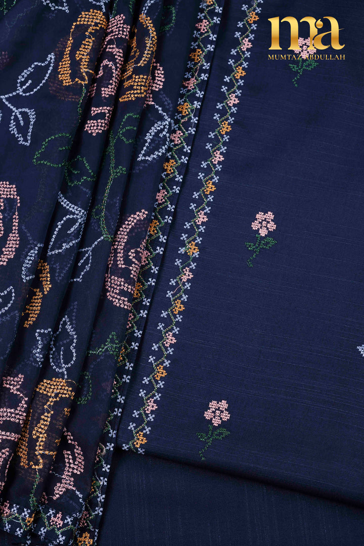 Classic MA embroidered suit on Karandi fabric with chiffon dupatta. Cross-stitch Embroidered motifs all over shirt. Heavy embroidered Chiffon Dupatta, jaal style embroidery all over, finished with embroidered border lace all round.