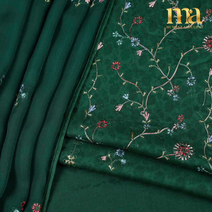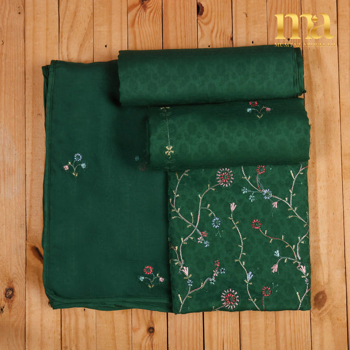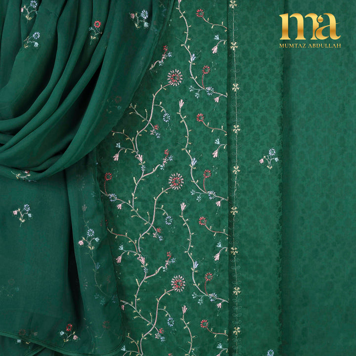 Classic MA 3pc Unstitched embroidered suit on Jacquard Lawn fabric with Chiffon dupatta. Shirt Front full Embroidery, light motifs on back and sleeves. Chiffon dupatta with motifs finished with pipin. Extra border given for designing.
