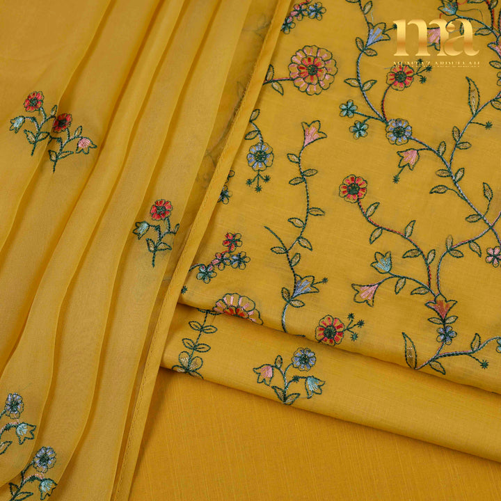 Classic MA 3pc Unstitched embroidered suit on Lawn fabric with Chiffon dupatta. Shirt Front full Embroidery, light motifs on back and sleeves. Chiffon dupatta with motifs finished with pipin. Extra border given for designing.