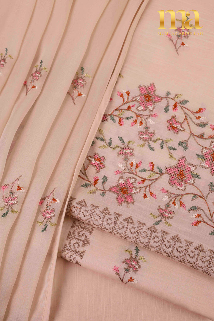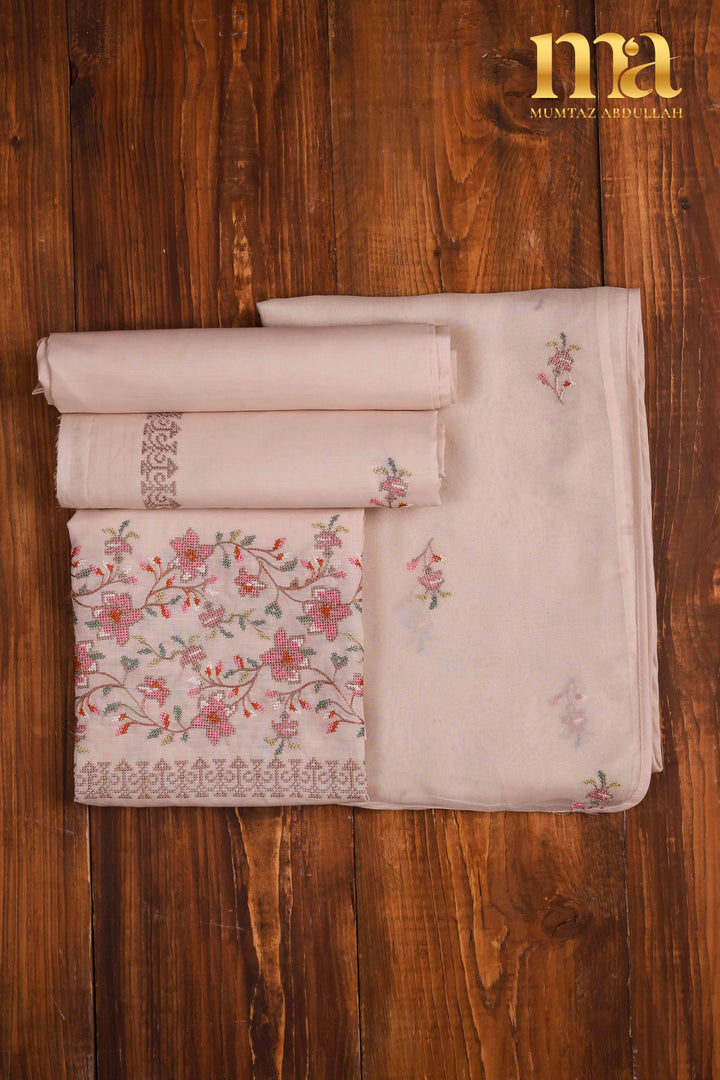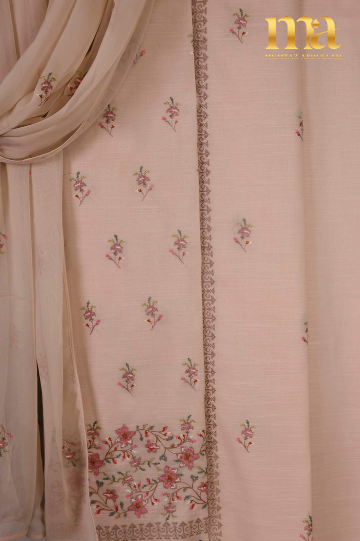 Classic MA embroidered suit on Lawn with chiffon dupatta. Cross stitch embroidered motifs on shirt front and daman. . Back & Sleeves plain. Light embroidered motifs style Chiffone dupatta finished with pipin.